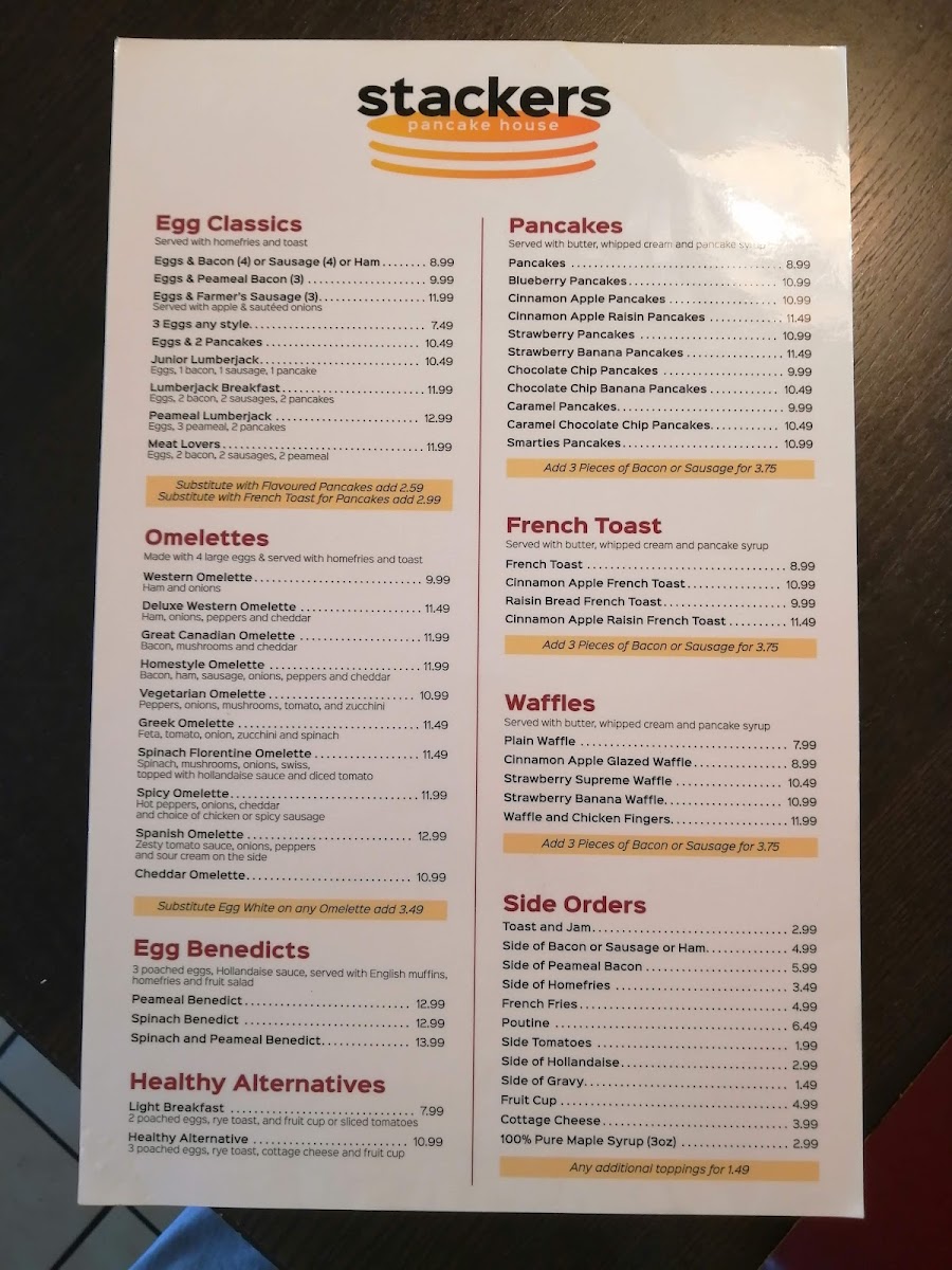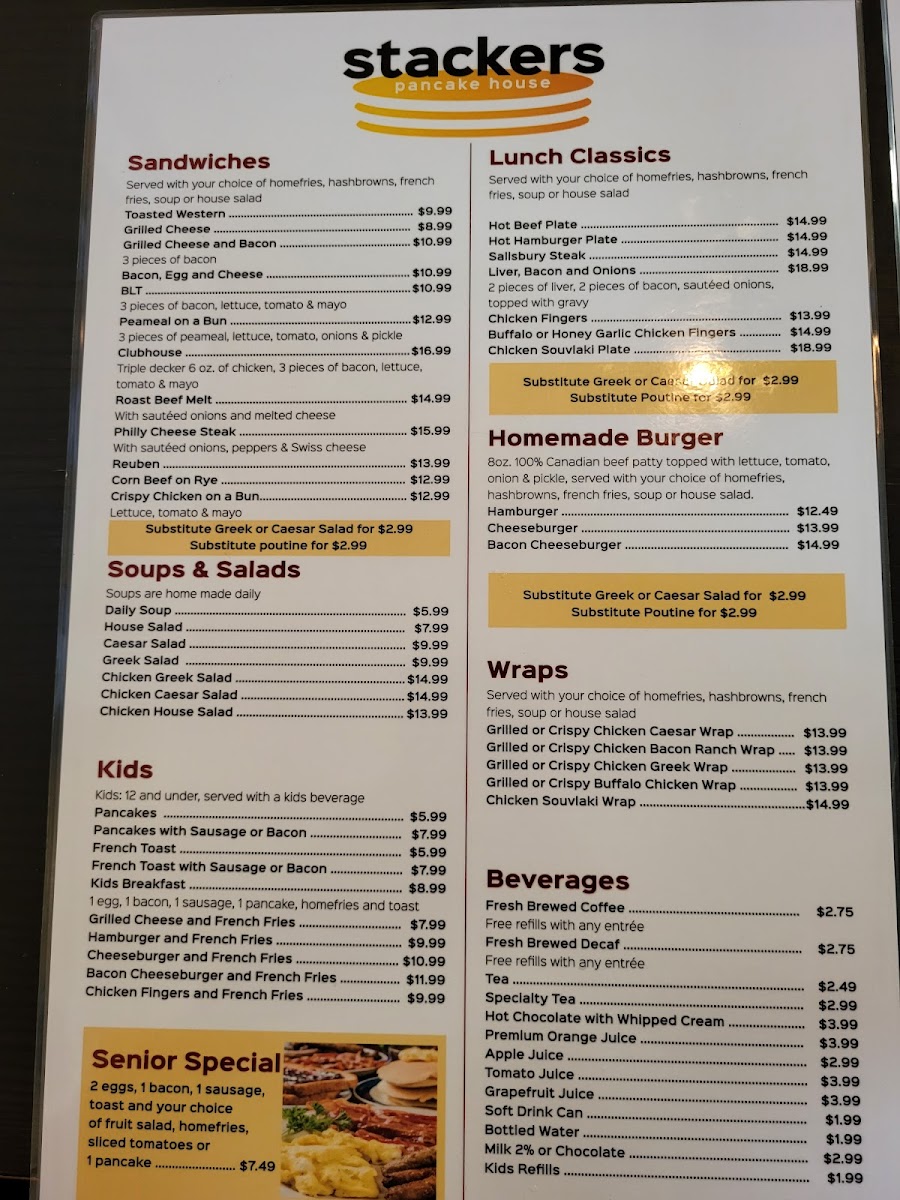 Stackers Pancake House offers a straightforward and comforting menu that fits perfectly with its friendly, casual atmosphere. The focus is on classic breakfast and brunch favorites, making it a welcoming spot for starting your day or enjoying a relaxed midday meal.